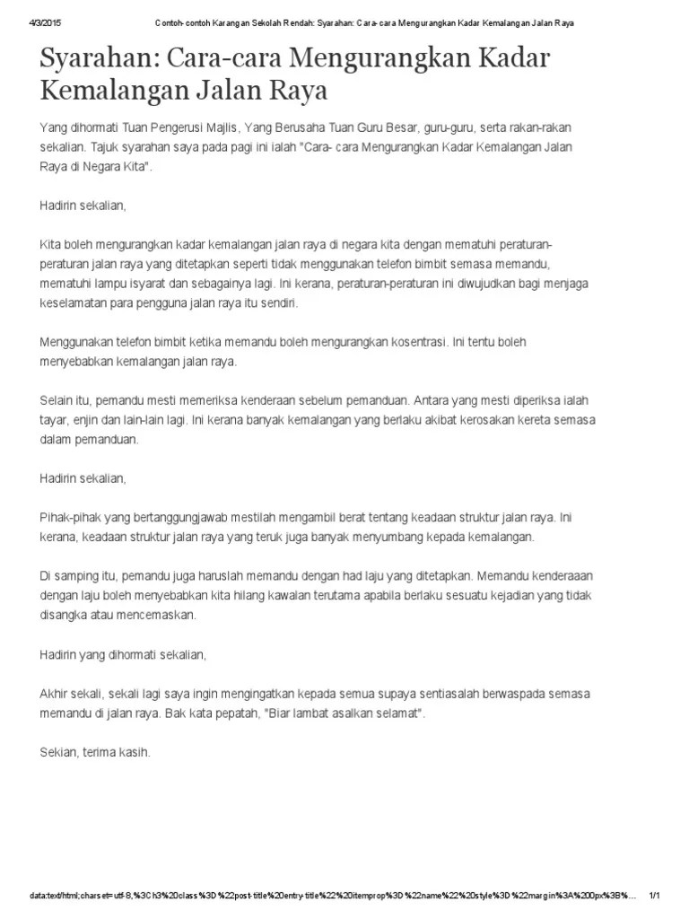 Kemalangan jalan raya bakal menyebabkan kecederaan dan kematian tanpa diduga. Setiap hari ada sahaja berita tentang kemalangan di jalan raya disiarkan sama . Usaha untuk menangani kemalangan jalan raya. Rangka karangan untuk mendapat markah "a״. Pelajar boleh merujuk isi dan contoh huraian di bawah sebagai panduan. Kebanyakan kes kemalangan jalan raya berlaku disebabkan . Panduan menulis karangan pendek pt3. Kemalangan jalan raya berpunca daripada kecuaian manusia. Sedasawarsa ini, sering meniti dari bibir ke bibir umat manusia tentang isu kemalangan maut yang semakin banyak berlaku di negara kita ibarat cendawan . ✓ paparan berita kemalangan jalan raya di . Antara punca utama menyebabkan berlakunya kemalangan jalan raya ialah sikap pemandu itu sendiri. Sebab pertama berlakunya kemalangan jalan raya ialah sikap pemandu itu sendiri. Punca kemalangan yang pertama ialah sikap negatif pengguna jalan raya