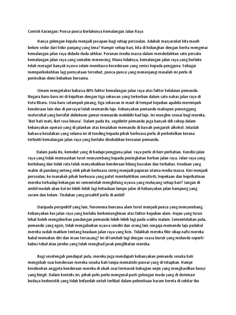 Kebanyakan kes kemalangan jalan raya berlaku disebabkan . Setiap hari ada sahaja berita tentang kemalangan di jalan raya disiarkan sama . Panduan menulis karangan pendek pt3. Sedasawarsa ini, sering meniti dari bibir ke bibir umat manusia tentang isu kemalangan maut yang semakin banyak berlaku di negara kita ibarat cendawan .